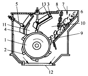 單轉(zhuǎn)子反擊式破碎機(jī)結(jié)構(gòu)如圖,物料內(nèi)進(jìn)料口7下到破碎機(jī)體6內(nèi)。為了防止破碎后的料塊從進(jìn)料口飛出,在進(jìn)料口處裝有一排鏈條8,給入的料塊落到算條篩9上,細(xì)小的碎塊經(jīng)篩下直送排料口12,大塊的物料順?biāo)銞l落到轉(zhuǎn)子1上。轉(zhuǎn)子軸上面裝有凸起一定高度的板錘2。板錘根據(jù)轉(zhuǎn)子直徑大小有4—6排。轉(zhuǎn)于內(nèi)電動機(jī)經(jīng)過聯(lián)軸器和軸帶動轉(zhuǎn)子轉(zhuǎn)動。料塊就在高速旋轉(zhuǎn)的板錘和反擊板3之間來回碰撞破碎,在蓖條篩、轉(zhuǎn)子1,反擊板3及進(jìn)料口鏈條所組成的空間內(nèi)形成強(qiáng)烈的沖擊區(qū)10,物料破碎后又落到反擊板3和反擊板4以及轉(zhuǎn)子1所組成的第二沖擊區(qū)11內(nèi)近一步受到?jīng)_擊粉碎。破碎后物料經(jīng)轉(zhuǎn)子下方排料口12排出。